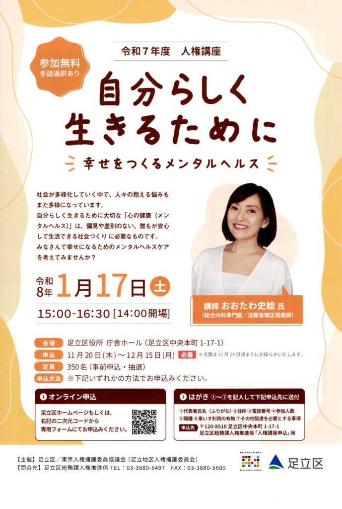 代表者の住所・氏名(ふりがな)・電話番号、参加人数、職種、車いす利用などの必要な配慮事項、「人権講座」を記入し、下記申込先に送付